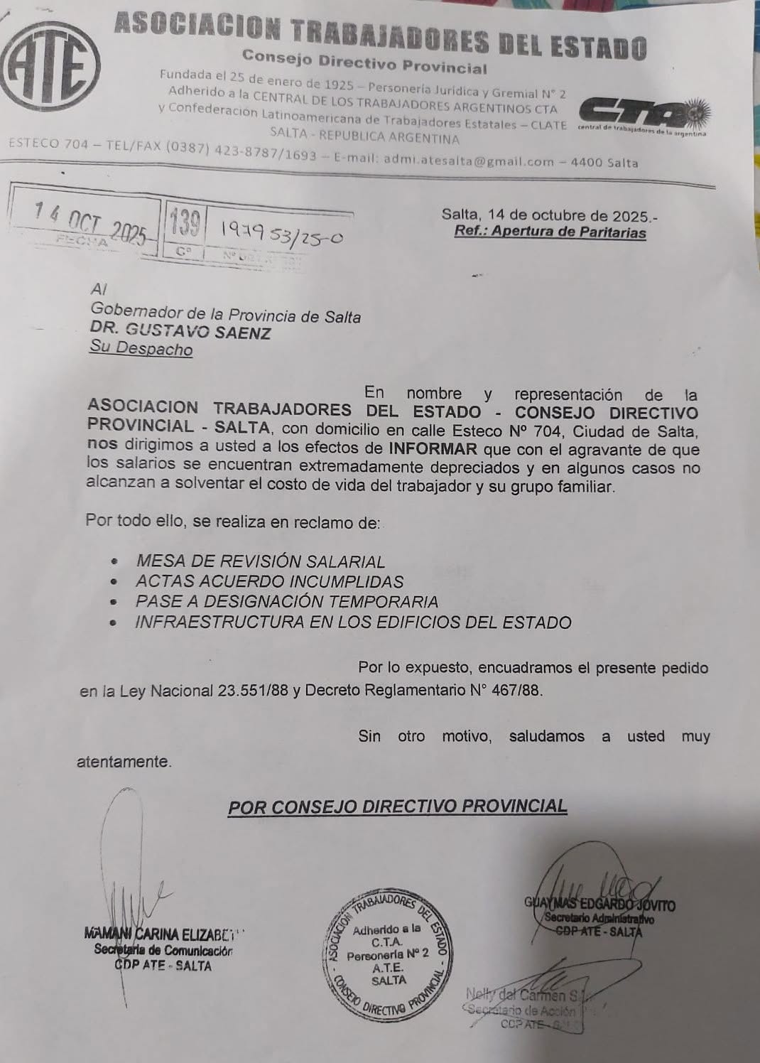 El 28 de octubre se concretó la reunión prevista en la Secretaría de Recursos Humanos de la Provincia con el Secretario Lic. Elif Risset y el Subsecretario Lic. Matías Albrecht, con la participación del CDP ATE Salta a través del Secretario Gral. Adjunto Raúl Rodríguez, Secretario de DDHH Ángel Olea y Secretaria de Acción Política Nelly Sánchez del CDP ATE, delegado Gremial de la Subsecretaría de Defensa Civil de la Provincia Gonzalo Zenzano, en la cual se definieron las fechas de las próximas reuniones para el tratamiento de los siguientes temas planteados mediante Expte. 197953/25-0 de fecha 14/10/25 presentado durante la movilización realizada el 14/10/25 por los trabajadores y representantes sindicales de ATE en Centro Cívico Grand Bourg: