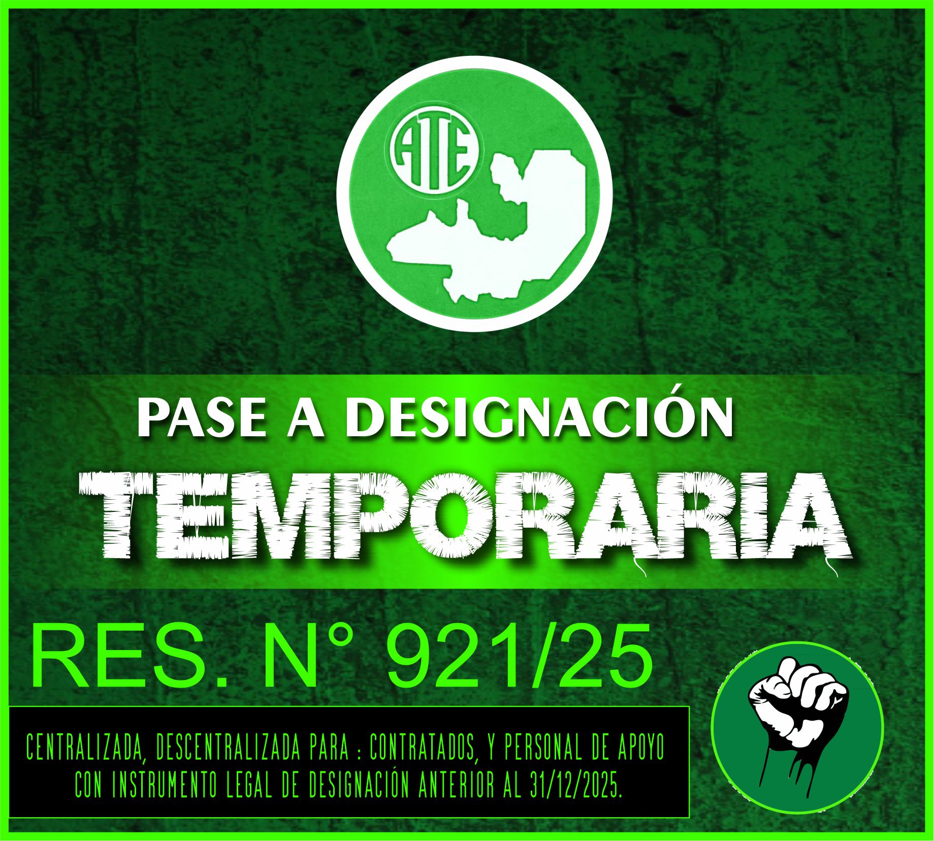 Inicio Sin categoría PASE A DESIGNACIÓN TEMPORARIA RES. 921/2025 PARA CONTRATADOS Y PERSONAL DE APOYO... Sin categoría PASE A DESIGNACIÓN TEMPORARIA RES. 921/2025 PARA CONTRATADOS Y PERSONAL DE APOYO CON INSTRUMENTO LEGAL DE DESIGNACION ANTERIOR AL 31/12/2025 Por CDP ATE - 2 enero, 2026 45 0 Facebook Twitter Pinterest WhatsApp VER LISTADO https://www.facebook.com/share/p/18BoBHWoGo/ Artículos relacionadosMás del autor NACIONAL CUMPLIMOS 101 AÑOS DE LUCHA Sin categoría ATE RECORRE LOS MUNICIPIOS EXIGIENDO EL PAGO DEL BONO A LOS TRABAJADORES MUNICIPALES Sin categoría CONSEJO DIRECTIVO PROVINCIAL ATE SALTA INFORMA RESOLUCION 921D /25 de la Secretaria de Gestión de Recursos Humanos de la Provincia de Salta. Síguenos562FansMe gusta565SeguidoresSeguir5,644SuscriptoresSuscribirte Novedades JORNADA DE LUCHA Y MOVILIZACIÓN POR LOS TRABAJADORES ORDENANZAS DEL INTERIOR... 19 enero, 2026 CUMPLIMOS 101 AÑOS DE LUCHA 15 enero, 2026 ATE RECORRE LOS MUNICIPIOS EXIGIENDO EL PAGO DEL BONO A LOS... 8 enero, 2026 CONSEJO DIRECTIVO PROVINCIAL ATE SALTA INFORMA RESOLUCION 921D /25 de la... 6 enero, 2026