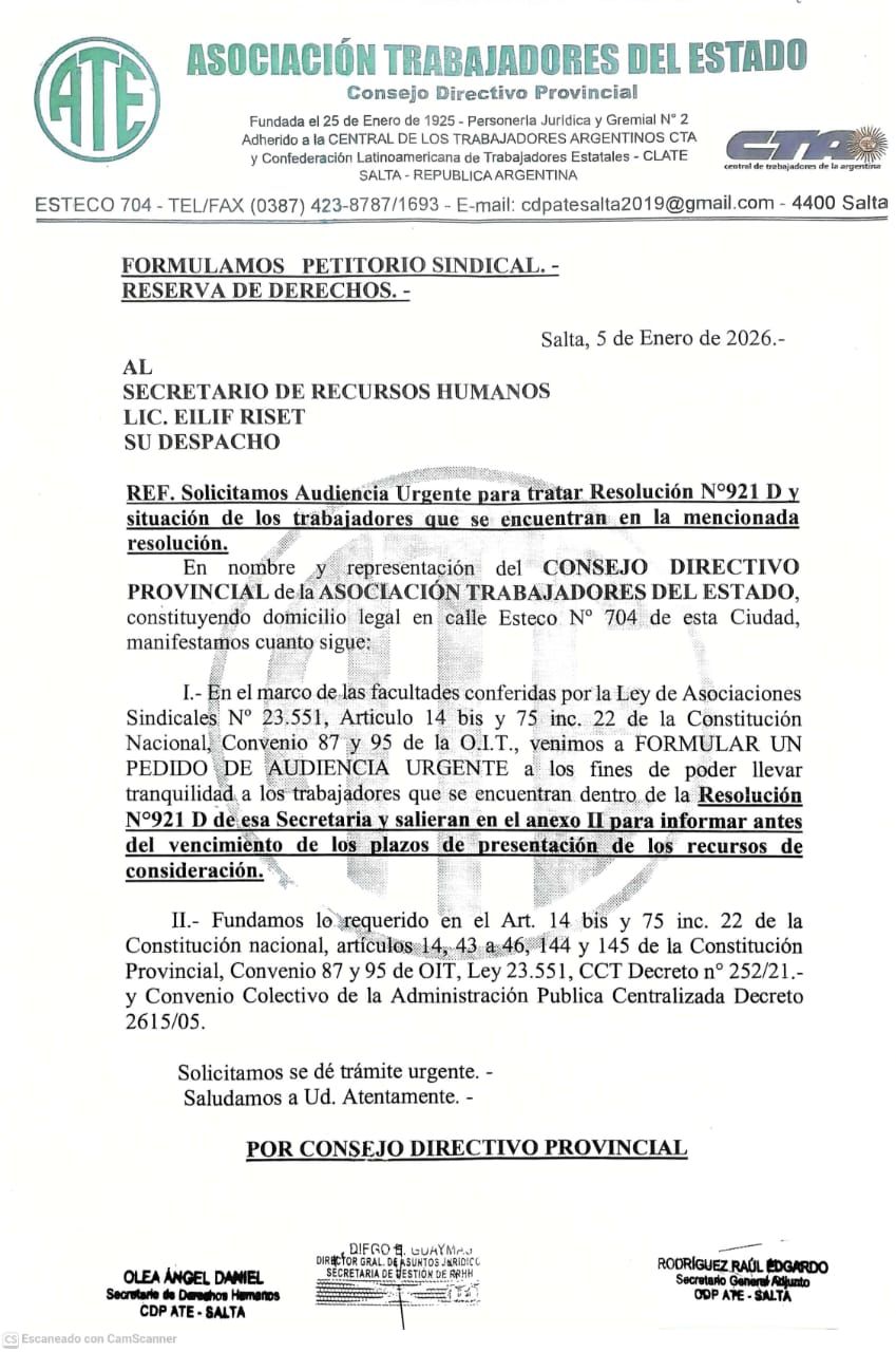 Inicio Sin categoría EL CDP ATE SALTA SOLICITO AUDIENCIA DE MANERA URGENTE PARA... Sin categoría EL CDP ATE SALTA SOLICITO AUDIENCIA DE MANERA URGENTE PARA TRATAR LA SITUACIÓN DE LOS TRABAJADORES INCLUIDOS DENTRO DE LA RESOLUCIÓN Nº 921 D. Por CDP ATE - 5 enero, 2026 69 0 Facebook Twitter Pinterest WhatsApp Artículos relacionadosMás del autor NACIONAL CUMPLIMOS 101 AÑOS DE LUCHA Sin categoría ATE RECORRE LOS MUNICIPIOS EXIGIENDO EL PAGO DEL BONO A LOS TRABAJADORES MUNICIPALES Sin categoría CONSEJO DIRECTIVO PROVINCIAL ATE SALTA INFORMA RESOLUCION 921D /25 de la Secretaria de Gestión de Recursos Humanos de la Provincia de Salta. Síguenos562FansMe gusta565SeguidoresSeguir5,644SuscriptoresSuscribirte Novedades JORNADA DE LUCHA Y MOVILIZACIÓN POR LOS TRABAJADORES ORDENANZAS DEL INTERIOR... 19 enero, 2026 CUMPLIMOS 101 AÑOS DE LUCHA 15 enero, 2026 ATE RECORRE LOS MUNICIPIOS EXIGIENDO EL PAGO DEL BONO A LOS... 8 enero, 2026 CONSEJO DIRECTIVO PROVINCIAL ATE SALTA INFORMA RESOLUCION 921D /25 de la... 6 enero, 2026